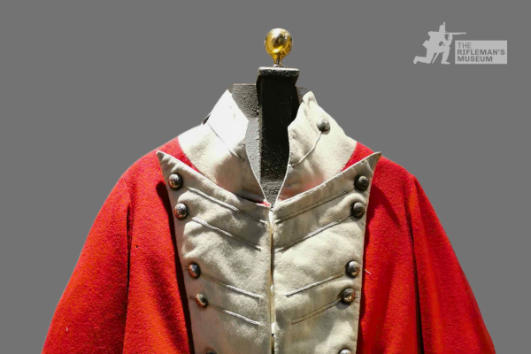 This coatee belonged to Lieutenant-Colonel John Hunt of the 52nd (Oxfordshire) Regiment of Foot (Light Infantry). The buttons bear the pattern used between 1804 and 1855. As short-tailed jackets, the distinctive mark of the Light Infantry, were replaced by long-tailed jackets for all ranks around 1820, this uniform must date from before that time. It seems more or less to match the jacket in the plate of an officer in the 52nd Regiment circa 1815, which was published in the 1896 Oxfordshire Light Infantry Chronicle.