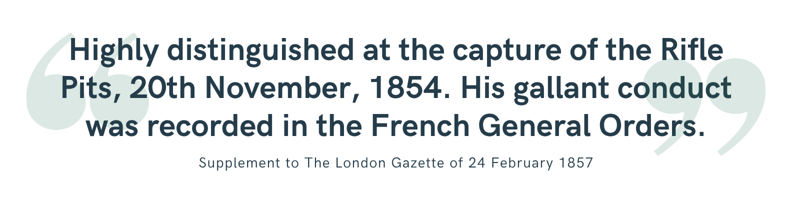 He also received the Order of the Medjidie (5th Class) and the Turkish Crimea Medal for his service during the campaign.